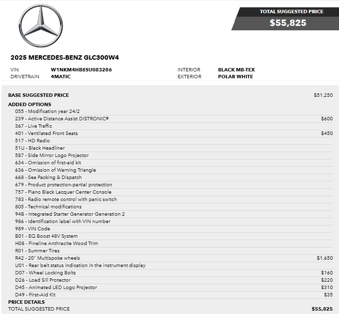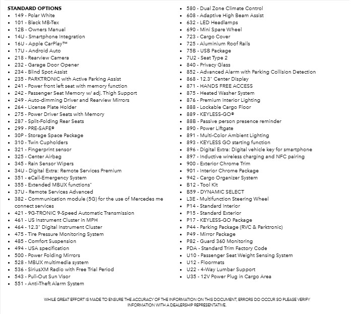 055 - 年份修改 24/2 239 - 主動式智慧測距輔助系統 DISTRONIC® $600 367 - 即時路況資訊 401 - 前座通風座椅 $450